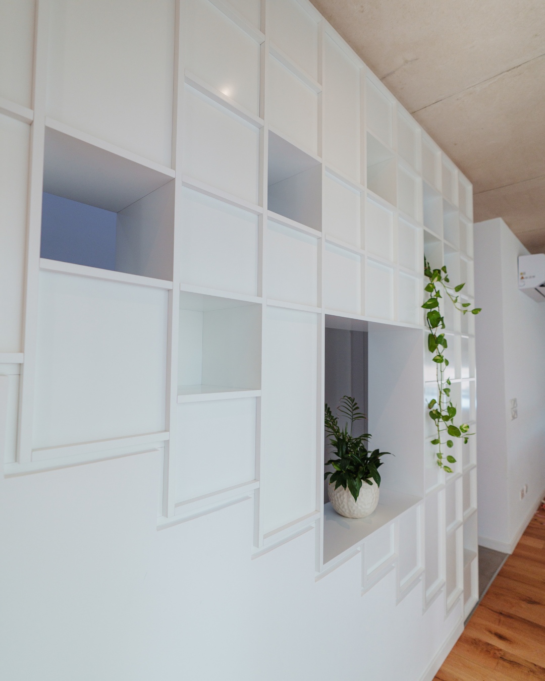 The design embraces a minimal aesthetic where every element serves a purpose, creating a space that feels effortless yet meticulously thought out. Warm wood ceilings contrast beautifully with the crisp white cabinetry, while natural light enhances the clean geometry of the interiors. The open-plan kitchen and living areas flow seamlessly, encouraging connection and functionality in everyday living. Subtle greenery and soft textures introduce a sense of calm, bringing nature indoors without overpowering the space.