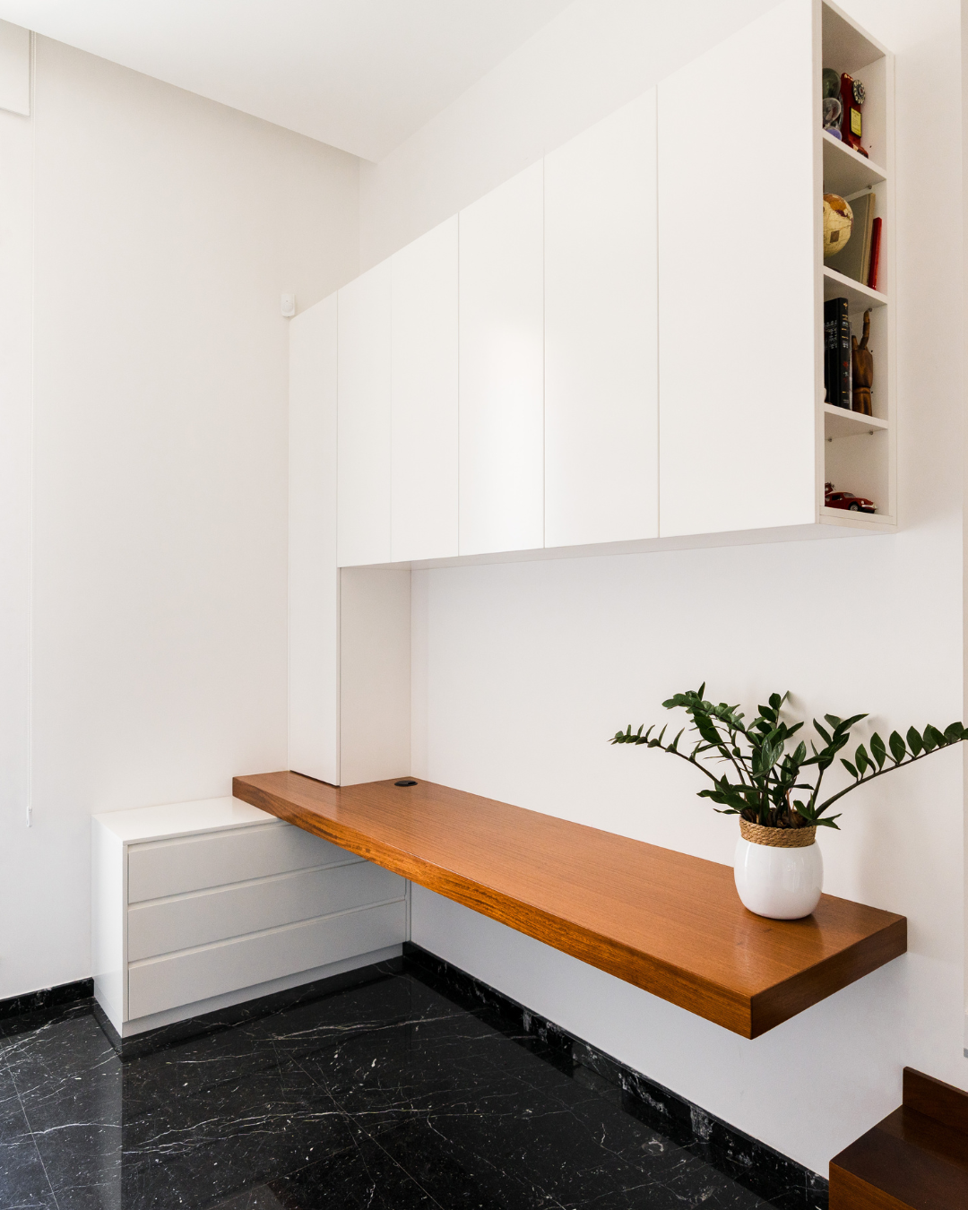 Library shelves that double as a table In a home library or study, wooden shelves don’t just have to stay on the wall. By installing a slightly deeper shelf at desk height, you create a surface that doubles as a table. This makes it easy to keep books, notepads, and stationery within reach, while also offering a convenient spot for reading or working on a laptop. It’s a clever blend of storage and practicality, especially in compact spaces.