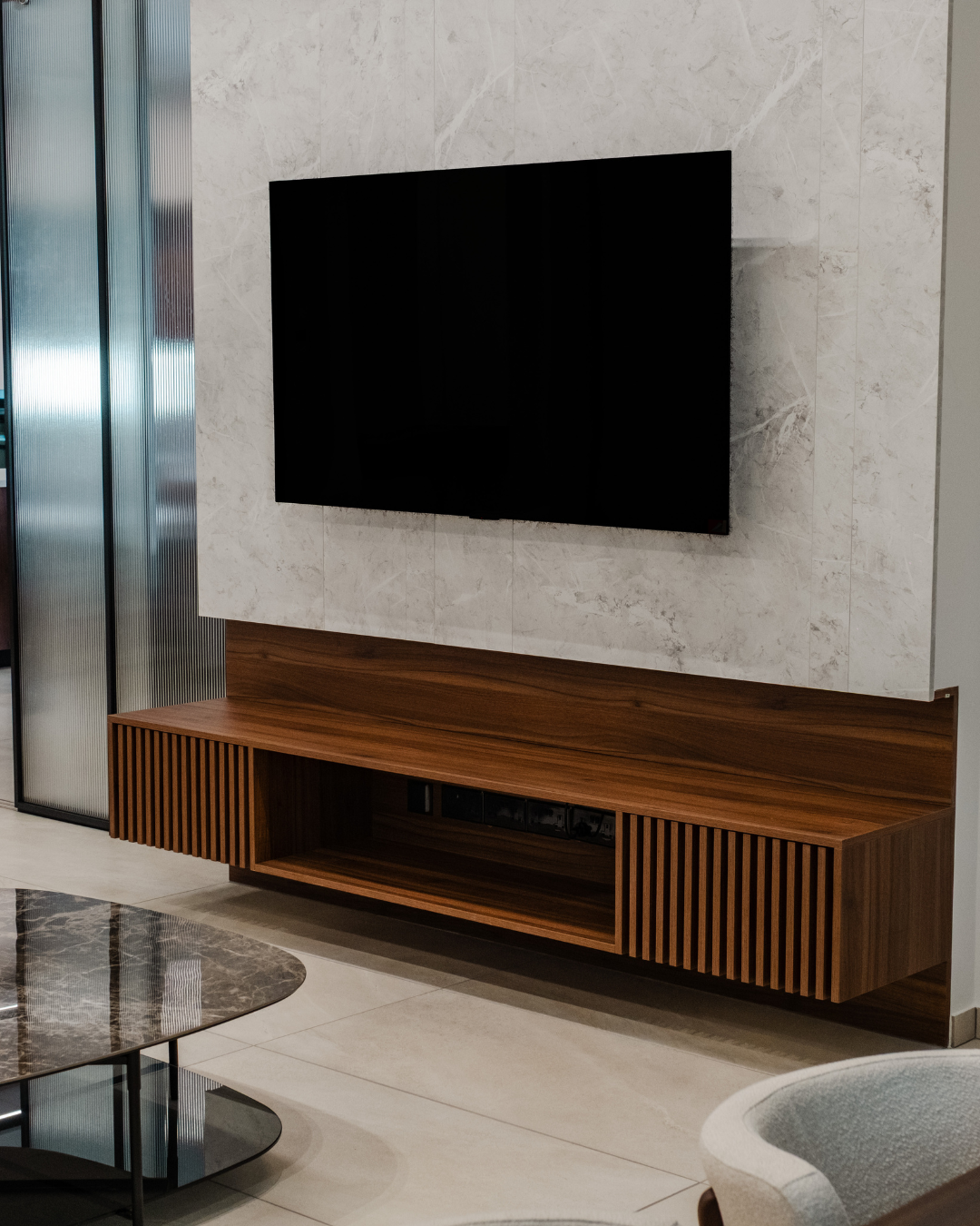 Seamless shelves behind the TV For a sleek, integrated look, consider seamless wooden shelves behind your TV unit. Built into the wall or designed as a full panel system, these shelves can frame the television beautifully while offering hidden or open compartments for storage. The result is a minimalist, clutter-free appearance where everything from cables to accessories feels intentionally designed.